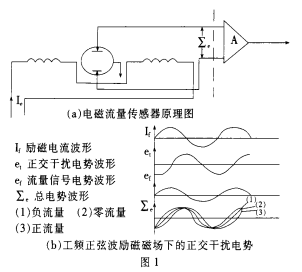 工頻干擾噪聲是由電磁流量傳感器勵磁繞組和流體、電極、放大器輸入回路的電磁耦合,其二是污水流量計工作現場的工頻共模干擾,其三是供電電源引入的工頻串模干擾等,其產生的物理機理均是電磁感應原理。*先就電磁流量傳感器勵磁繞組和流體、電極、放大器輸入回路的電磁耦合產生的工頻干擾對污水流量計工作影響*大,而且在不同的勵磁技術下其表現的形態、特性不同,因而采取抗干擾措施也不同,電磁流量傳感器原理見圖1(a) 。在工頻正弦波勵磁磁場下,此種電磁耦合工頻干擾噪聲表現形式為正交干擾(見圖1b),又稱為變壓器電勢,其特點是干擾噪聲幅值和工頻正弦波勵磁頻率成正比,相位滯后流量信號電勢90°,且幅值較流量信號電勢大幾個數量級。