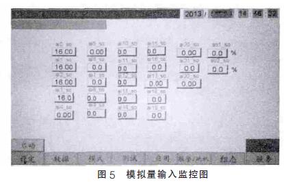 上位機(jī)觸控屏軟件是利用觸控屏供應(yīng)商的組態(tài)軟件設(shè)計(jì)的,作為一個(gè)將運(yùn)用于工業(yè)現(xiàn)場(chǎng)的監(jiān)控設(shè)備,其實(shí)用性和易用性是使用者比較重視的。當(dāng)下位機(jī)的通訊任務(wù)接收到信號(hào)量, 主控制模塊就會(huì)開始和上位機(jī)通信。下位機(jī)將采集到處理完整的數(shù)據(jù)傳輸?shù)缴衔粰C(jī)內(nèi),上位機(jī)將其顯示到觸控屏上,使用者可以通過(guò)上位機(jī)了解空壓機(jī)組的實(shí)時(shí)狀態(tài)。圖5 和圖6 就是模擬量和數(shù)字量各個(gè)通道的實(shí)時(shí)值顯示畫面。