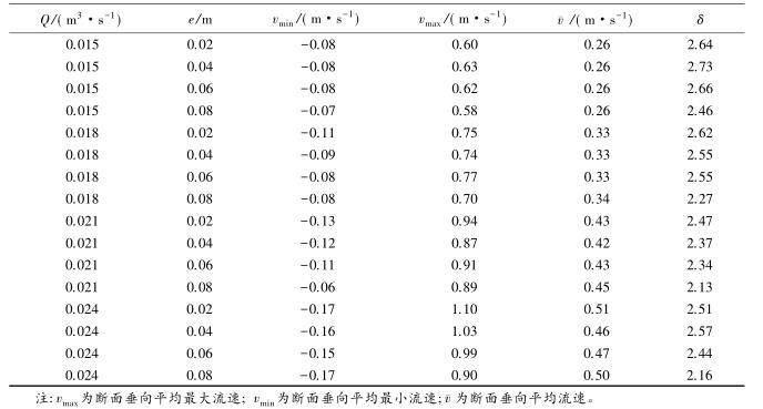 流速沿斷面分布的均勻特性可以通過流速分布不均勻系數進行表征,通過所選取斷面*大流速和*小流速的差值與該斷面平均流速的比值,δ值越大表明浮體結構的存在對水流斷面流速的分布產生的影響較大。表2中,當來流流量相同時,流速的不均勻系數多數隨e的增大而減小。浮體結構位置較小時,主流為浮體結構上部的水流。隨著浮體結構位置的上升,來自上游的水體逐漸分成浮體結構上部和下部的兩股主流,流速分布的不均性減小。浮體結構位置及所處水位條件相同時,來流流量的增大,區域的平均流速增大,因此流速不均勻性減小。