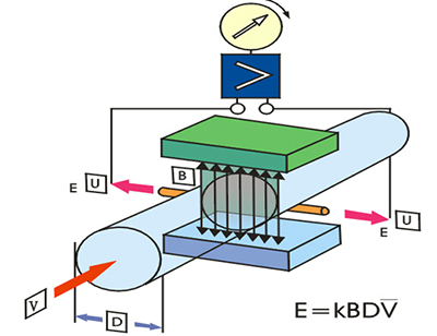 電磁流量計(jì)的工作原理是基于法拉*電磁感應(yīng)定律。在測量管內(nèi)的導(dǎo)電介質(zhì)相當(dāng)于法拉*試驗(yàn)中的導(dǎo)電金屬桿,上下兩端的兩個電磁線圈產(chǎn)生恒定磁場。當(dāng)有導(dǎo)電介質(zhì)流過時,則會產(chǎn)生感應(yīng)電壓。管道內(nèi)部的兩個電極測量產(chǎn)生的感應(yīng)電壓。