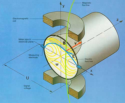 當(dāng)導(dǎo)電液體沿測(cè)量管在交變磁場(chǎng)與磁力線成垂直方向運(yùn)動(dòng)時(shí),導(dǎo)電液體切割磁力線產(chǎn)生感應(yīng)電勢(shì)。在與測(cè)量管軸線和磁力線相互垂直的管壁上安裝了一對(duì)檢測(cè)電極,將這個(gè)感應(yīng)電勢(shì)檢出。