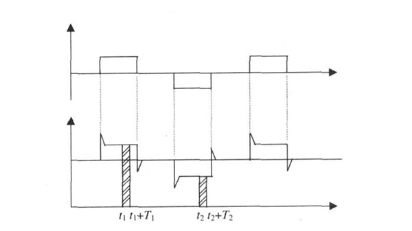 給水廠原水電磁流量計(jì)一般都采用工頻交流電源供電, 其電源電壓的幅值和頻率的變化都會(huì)給給水廠原水電磁流量計(jì)帶來(lái)電源性干擾噪聲。對(duì)電源電壓的幅值變化, 因采用多級(jí)集成穩(wěn)壓, 一般而言電源電壓的幅值變化對(duì)電磁流量的測(cè)量精度影響不大。當(dāng)電源電壓的頻率波動(dòng)時(shí), 雖然其波動(dòng)范圍有限, 但對(duì)給水廠原水電磁流量計(jì)測(cè)量精度影響較大。為了解決工頻干擾問(wèn)題, 實(shí)現(xiàn)對(duì)流體流速感應(yīng)電勢(shì)eab信號(hào)的準(zhǔn)確測(cè)量, 需利用以下基本關(guān)系:①勵(lì)磁周期為工頻周期的整數(shù)倍, 即勵(lì)磁頻率為50/nHz(n為偶數(shù));②正負(fù)勵(lì)磁下的同相位采樣。圖2是對(duì)應(yīng)低頻矩形波勵(lì)磁形式下的典型電勢(shì)信號(hào)形式, 按上述關(guān)系在一個(gè)勵(lì)磁周期下, 若假設(shè)t1 和t2 點(diǎn)為工頻干擾的等效干擾點(diǎn), 且采樣寬度T=T1 =T2 , 則eab的基本算式為: