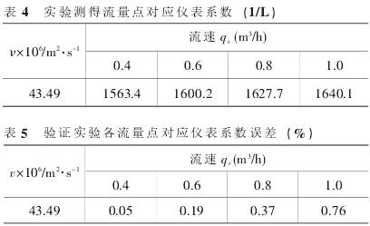 為證明該高粘度變流速自適應(yīng)算法及公式的有效性,重新選取四個流量點:0.4m3/h、0.6m3/h、0.8m3/h、1.0m3/h對該公式以及算法進行精度驗證,得到表4數(shù)據(jù),表5為各對應(yīng)流量點的擬合后儀表系數(shù)的誤差。