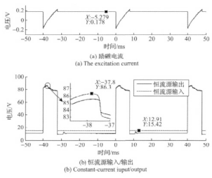由圖7曲線結合圖2可知,在勵磁方向切換后,檢流電路檢測到的圖7(a)中的勵磁電流瞬間為負,此時勵磁線圈處于電能泄放狀態并向能量反饋電路中的儲能電容充電。由于儲能電容充電,高、低壓切換電路的輸出電壓從80V逐漸升高;待勵磁線圈能量泄放完即勵磁電流為零時,儲能電容兩端電壓達到*高86V并開始放電,勵磁電流開始上升;儲能電容電壓降低至80V時,高低壓切換電路趨于80V的穩定輸出狀態,此時勵磁電流繼續上升;待勵磁電流上升至設定的超調量205 mA后,遲滯比較電路控制高低壓切換電路切換至17V低壓源作為勵磁工作電源,恒流電路在17V低壓源輸入下進行恒流控制輸出。