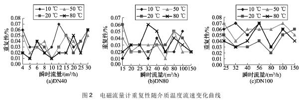 將實(shí)驗(yàn)測得的環(huán)保污水專用流量計(jì)在不同溫度及流速下的重復(fù)性數(shù)據(jù)整理,特性曲線如圖2所示,3組曲線分別對應(yīng)DN40、DN80、DN100的3塊環(huán)保污水專用流量計(jì)的重復(fù)性曲線。