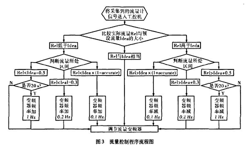 實(shí)際生產(chǎn)中流量一直在某個(gè)區(qū)域內(nèi)波動(dòng),且其動(dòng)態(tài)特性不易掌握。從上面的理論中我們能夠讓誤差△£盡可能的小,這樣距我們所需要的理論值%就越接近。而減小誤差需要我們把n取的盡可能大,也就是在生產(chǎn)時(shí)間內(nèi)劃分更多的周期去調(diào)節(jié)流量。當(dāng)工控機(jī)根據(jù)工業(yè)污水印染廢水流量計(jì)傳送回來的信號(hào)發(fā)出調(diào)節(jié)變頻器工作頻率的指令后,電機(jī)調(diào)整功率到工業(yè)污水印染廢水流量計(jì)的實(shí)際測量為一個(gè)工作周期,我們知道從指令發(fā)送到實(shí)際測量值返回有一個(gè)較大的滯后,如果調(diào)節(jié)的周期時(shí)間小于流量計(jì)本身的一個(gè)工作周期,那么顯然不可能達(dá)到減小誤差的目的。利用模糊控制思想H。,在控制程序中我們把流量的波動(dòng)區(qū)域劃分為±缸×Yo,Yo-t-O.3,Yo±0.5四個(gè)區(qū)域,其中缸為可調(diào)節(jié)的誤差范圍,生產(chǎn)中我們?nèi)?.015,流量區(qū)域劃分的單位均為t/h。針對(duì)不同的區(qū)域采取不同的調(diào)整方案。具體流程如圖3所示。圖中變量Rel表示實(shí)際測量的流量,變量Idea表示理論流量。