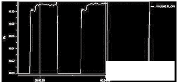 灌裝頭的*終出口部分為10~14mm的可更換縮口。通過(guò)縮口,可以產(chǎn)生背壓,一般縮口內(nèi)置蜂窩狀虹吸管,保證灌裝前后的管道滿管。從測(cè)試的流量波形上看,10mm的灌裝頭產(chǎn)生適當(dāng)?shù)淖枘嵝Ч髁壳€較穩(wěn)定。