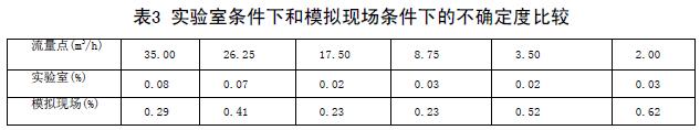 實驗室條件下和模擬現場條件下的不確定度比較(表3)兩次結果可以看出,兩次實驗各個流量點的不確定度差距非常大。可見,井水流量計對安裝條件還是比較苛刻的。