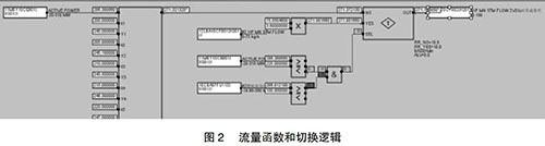但是由于近期趨勢可能收集不到部分負(fù)荷段的相關(guān)數(shù)據(jù),在超出現(xiàn)有數(shù)據(jù)負(fù)荷的部分應(yīng)采取必要的補救措施,可以參考相同負(fù)荷運行的另一臺余熱鍋爐的主蒸汽流量,以此來彌補現(xiàn)有數(shù)據(jù)的不足。為了保證數(shù)據(jù)切換的可靠性,切換條件要嚴(yán)謹(jǐn),現(xiàn)有函數(shù)的負(fù)荷下線上增加25MW與另外一臺的燃機負(fù)荷大于100MW。如此設(shè)置的好處是當(dāng)另一臺運行機組突然故障或跳機時保證數(shù)據(jù)能及時切換到函數(shù)輸出,保證機組的安全運行。具體操作見圖2。