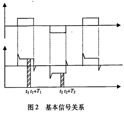 污水廠進(jìn)水管道流量計(jì)一般都采用工頻交流電源供電,其電源電壓的幅值和頻率的變化都會(huì)給污水廠進(jìn)水管道流量計(jì)帶來電源性干擾噪聲。對(duì)電源電壓的幅值變化,因采用多級(jí)集成穩(wěn)壓,一般而言電源電壓的幅值變化對(duì)電磁流量的測量精度影響不大。當(dāng)電源電壓的頻率波動(dòng)時(shí),雖然其波動(dòng)范圍有限,但對(duì)污水廠進(jìn)水管道流量計(jì)測量精度影響較大。為了解決工頻干擾問題,實(shí)現(xiàn)對(duì)流體流速感應(yīng)電勢e柚信號(hào)的準(zhǔn)確測量,需利用以下基本關(guān)系:①勵(lì)磁周期為工頻周期的整數(shù)倍,即勵(lì)磁頻率為50/nHz(n為偶數(shù));②正負(fù)勵(lì)磁下的同相位采樣。圖2是對(duì)應(yīng)低頻矩形波勵(lì)磁形式下的典型電勢信號(hào)形式,按上述關(guān)系在一個(gè)勵(lì)磁周期下,若假設(shè)t。和t:點(diǎn)為工頻干擾的等效干擾點(diǎn),且采樣寬度T=T1=T2,則e –ab的基本算式為:,