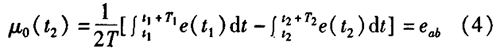 智能濃硫酸電磁流量計一般都采用工頻交流電源供電,其電源電壓的幅值和頻率的變化都會給智能濃硫酸電磁流量計帶來電源性干擾噪聲。對電源電壓的幅值變化,因采用多級集成穩(wěn)壓,一般而言電源電壓的幅值變化對電磁流量的測量精度影響不大。當(dāng)電源電壓的頻率波動時,雖然其波動范圍有限,但對智能濃硫酸電磁流量計測量精度影響較大。為了解決工頻干擾問題,實現(xiàn)對流體流速感應(yīng)電勢e柚信號的準(zhǔn)確測量,需利用以下基本關(guān)系:①勵磁周期為工頻周期的整數(shù)倍,即勵磁頻率為50/nHz(n為偶數(shù));②正負(fù)勵磁下的同相位采樣。圖2是對應(yīng)低頻矩形波勵磁形式下的典型電勢信號形式,按上述關(guān)系在一個勵磁周期下,若假設(shè)t。和t:點為工頻干擾的等效干擾點,且采樣寬度T=T1=T2,則e –ab的基本算式為:,