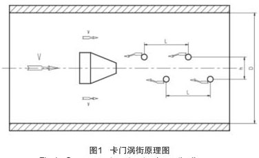 插入式煙氣流量計實現流量測量的理論基礎是流體力學中**的“卡門渦街”原理,在流動的流體中裝置一個非線性三角柱形體,即渦旋發生體,如圖 1 所示。當流體沿渦旋發生體繞流時,會在渦旋發生體下游產生兩列不對稱,但有規律交替地分離釋放出一系列漩渦束,只有當兩渦漩列之間的距離 h 和同列的兩渦漩之間的距離 L 之比滿足 h/L=0.281 時,所產生的渦街才是穩定的。