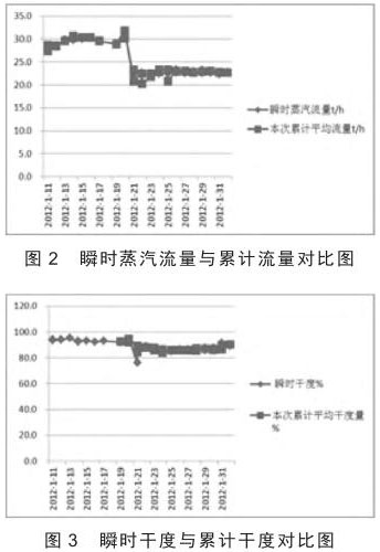 根據(jù)錐型孔板流量計在稠油 SAGD 的應用數(shù)據(jù),將瞬時蒸汽流量與累計平均流量、瞬時干度與累計平均干度、瞬時蒸汽流量與鍋爐流量、累計平均流量與鍋爐流量、瞬時干度與鍋爐干度、累計平均干度與鍋爐干度、瞬時流量誤差與累計流量誤差、瞬時干度誤差與累計平均干度誤差繪成散點圖(圖 2 - 圖 5)。