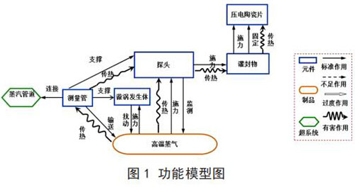 建立已有系統的功能模型(見圖 1)。通過功能模型分析,描述了系統元件及其之間的相互關系,并得出導致傳感器耐受溫度不足問題的功能因素:高溫蒸氣對測量管傳熱;測量管對探頭傳熱;探頭對灌封物傳熱;灌封物對壓電陶瓷片傳熱;高溫蒸氣對探頭傳熱。