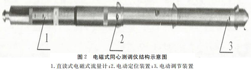 電磁式同心測調(diào)儀是同心分層注水工藝技術(shù)的關(guān)鍵儀器,其設(shè)計(jì)理念:集成流量測試與水量調(diào)節(jié)于一體,實(shí)現(xiàn)測調(diào)同 步;動力傳遞設(shè)計(jì)為同心降速機(jī)制,機(jī)械結(jié)構(gòu)簡單,動力傳遞效率高,測調(diào)穩(wěn)定性高。主要包括以下結(jié)構(gòu),如圖2所示。