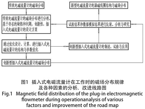 電磁流量計因其特殊的結構形式,致使其抗干擾能力較弱、準確度偏低以及瞬時流量波動過大等不良現(xiàn)象,但便于安裝、造價低廉、普遍應用于大管道等特點而存在。為了發(fā)揮其優(yōu)勢,消除其不利因素,對其內部結構及其相關技術參數進行優(yōu)化設計,從而使其準確度能夠達到 ±1% FS,使抗干擾能力得到極大地增強。本文主要通過優(yōu)化設計、選擇材料和試驗,使電磁流量計的穩(wěn)定性和準確度大幅度提高,并提出解決措施,對實際應用具有參考價值。分析與研究程序圖如圖 1 所示。