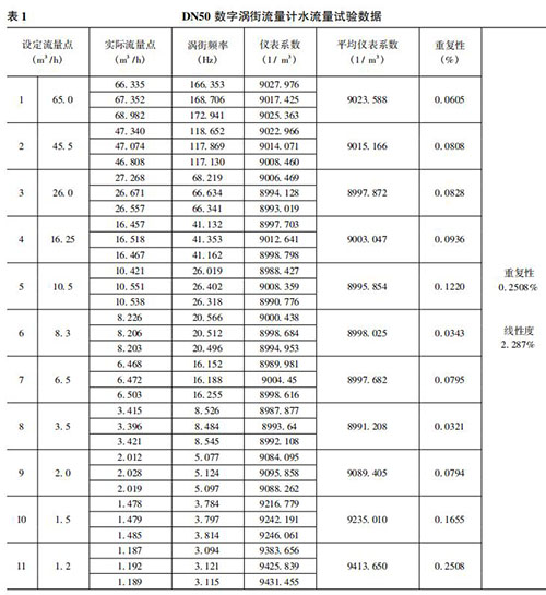 將本文實現(xiàn)的數(shù)字煙氣流量計在上述 50mm 口 徑( 簡稱 DN50) 的水流量試驗裝置上進行試驗。先在其正常流量范圍內(nèi)進行試驗,流量從大到小逐漸降低,之后不斷探求其所能測量的*小流量。每個流量點試驗三次,計算其重復性、平均儀表系數(shù)和線性度。水流量試驗數(shù)據(jù)如表 1 所示。