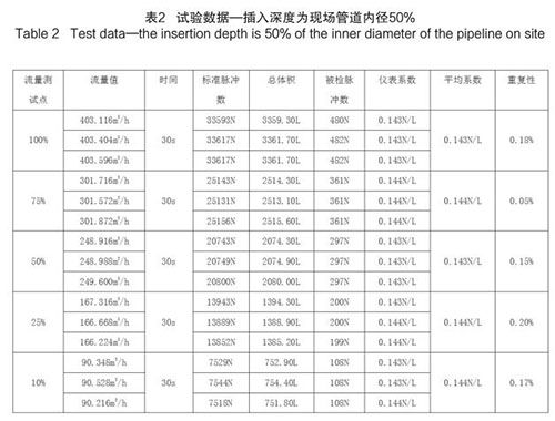 插入式壓縮空氣流量計插入深度為現場管道內徑的50%時,試驗數據如下(以 DN200 為例):