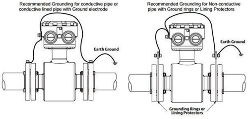 法蘭式流量管:當法蘭式流量管安裝在非金屬,塑料,PVC或襯里的工藝管道之間時,SG必須通過除工藝管道法蘭螺栓之外的其他路徑。在這種安裝方案中,需要接地環或接地電極(圖6)。