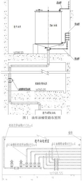 透平油油庫及油處理室設(shè)置在發(fā)電機(jī)出線層。油庫中安裝4個(gè)油桶,單個(gè)油桶容積為25m3。按照功能劃分為2個(gè)運(yùn)行油桶,2個(gè)凈油桶。每個(gè)油桶ding部設(shè)置一根油桶進(jìn)油管,油桶下部設(shè)置一根給機(jī)組供油管,油桶底部設(shè)置一根事故排油管,經(jīng)事故排油閥引入事故油池中,事故排油管上引出一根油桶排油管。各油桶的進(jìn)油管、供油管、排油管分別引入油處理室中。具體布置形式可見圖1所示。油處理室中設(shè)置一個(gè)容積為1m3的移動(dòng)油箱,用于向設(shè)備添油或臨時(shí)儲(chǔ)油。