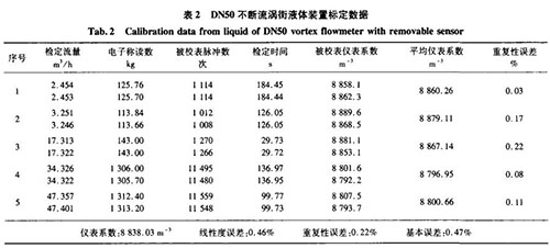 分別用精度0.5級(jí)音速?lài)娮鞖怏w標(biāo)定裝置、精度0.2級(jí)稱(chēng)重法水標(biāo)定裝置對(duì)DN50口徑的不斷流渦街進(jìn)行實(shí)際標(biāo)定,其標(biāo)定數(shù)據(jù)如表1、表2所示。