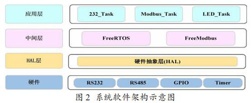 Modbus 通訊模塊的軟件架構(gòu)如圖 2 所示,分為硬件層、硬件抽象層,中間層和應(yīng)用層。中間層包括一個實時操作系統(tǒng)FreeRTOS 和一個針對嵌入式環(huán)境開發(fā)的輕量級 Modbus 協(xié)議庫Freemodbus。在應(yīng)用層,主要創(chuàng)建了三個任務(wù),232_Task 負責讀 取和解析流量計表頭輸出的文本信息,Modbus_Task 負責存儲 解析后的流量計數(shù)據(jù)到 Modbus 寄存器表,以及以 Modbus 協(xié)議與取水監(jiān)測設(shè)備通信,LED_Task 是一個輔助任務(wù),主要用來提示程序運行狀態(tài)。