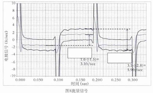 舉例,如圖5所示,線圈采用5Hz驅(qū)動(dòng)時(shí)的0feet/s,3.1feet/s,5.9feet/s流速下的電極信號,利用上述方法對信號進(jìn)行處理并計(jì)算流速。取每半波*后的20%納入流速計(jì)算,正半波與負(fù)半波相減即是流速。如3.1feet/s–(-2.8feet/s)=5.9feet/s,雖然有+0.15 feet/s的直流偏置,但也不影響流速的計(jì)算。因線圈是5Hz驅(qū)動(dòng),半波的20%是20ms,正好是1個(gè)完整的工頻周期,這樣就不受工頻干擾的影響。正半波與負(fù)半波相減,這樣就避免了直流偏置和共模干擾的影響。再加上在數(shù)字濾波過程中使用限幅濾波和算數(shù)平均,保證了流量信號的有效提取。