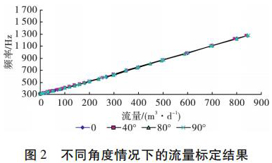 為了考察井眼斜度變化對電磁流量計測量流量的影響,開展了非集流高壓電磁流量計在不同斜度情況下的流量測量模擬實驗。模擬實驗在大慶油田多相流實驗室進行,儀器外徑 38 mm,模擬井筒內徑為 124 mm,實驗介質是水,傾斜角度分別為 0°、40°、80°和 90°( 水平) ,流量范圍為 5 ~ 850 m3 /d。實驗結果表明,在儀器居中條件下,井眼斜度變化對電磁流量計的儀表常數沒有影響,滿量程誤差不大于 4% ,因此可以應用高壓電磁流量計進行水平井注水剖面測量。不同角度情況下的實驗結果如圖 2 所示。