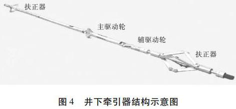 水平井注水井注入剖面測井工藝原理如圖 3 所示。在垂直井段,儀器在重力作用下可以通過注入管柱下入到井內,注入管柱下端須裝有喇叭口,且喇叭口應在造斜點以上,保證測井完成后儀器順利起出,不發生卡儀器問題。儀器通過喇叭口以后在重力作用下繼續向下移動,當儀器不能靠重力下移時,啟動牽引器,利用牽引器將儀器推送到井底,上提電纜過程中進行測井。