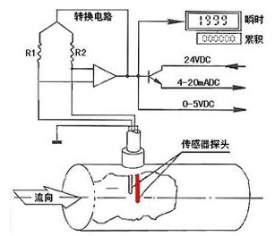 從上面公式可以引申出兩種熱式原理:把分母的溫度差恒定,通過實時測量氣體帶走熱量H的大小來得到氣體的質量流量,這就是目前市場上主流的恒溫差熱式。如果把分子的熱量H恒定,實時測量溫度差的大小來得到氣體質量流量,就是恒功率熱式。