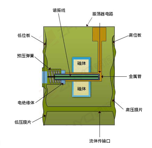 由磁場驅動的振蕩器電路會導致導線以其共振頻率振蕩。導線的一側牢固地固定到靜態部件,而另一側則連接到膜片。彈簧使電線預緊。由于過程壓力對隔膜的影響,金屬絲將在壓力升高時拉伸,而在壓力降低時收縮。共振頻率將相應地增加或減少。數字計數器測量諧振頻率的變化,并將其信號傳遞給微芯片,該微芯片還處理線性化補償和溫度補償。