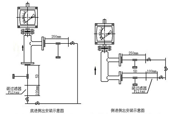 4.若介質中含有固體雜質,應在閥門和直管段間加裝過濾器;若介質中含有鐵磁物質,應在指針浮子流量計的上游安裝磁過濾器。