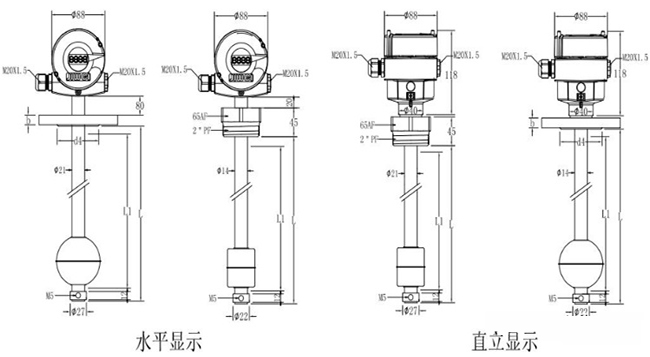 為更直觀地給用戶展現浮球式液位計的規格,請參考兩種浮球式液位計水平顯示以及直立顯示的不同規格尺寸,如下圖所示: