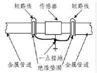 由于污水處理流量計的測量感應電壓很小,電壓較低,易受外界電磁噪聲的影響,故在安裝時應進行可靠的接地連(跨)接。金屬管道污水處理流量計接地連(跨)接方法如圖3所示。