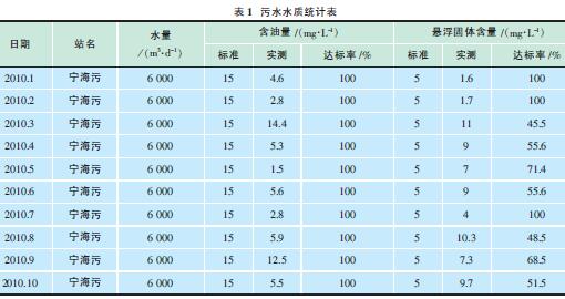 以一礦為例,2010年1~10月寧海污水站累計處理污水187萬m3,日均6200m3,1~10月份外輸污水含油累計達標率100%,外輸懸浮物累計達標率69.7%(見表1)。